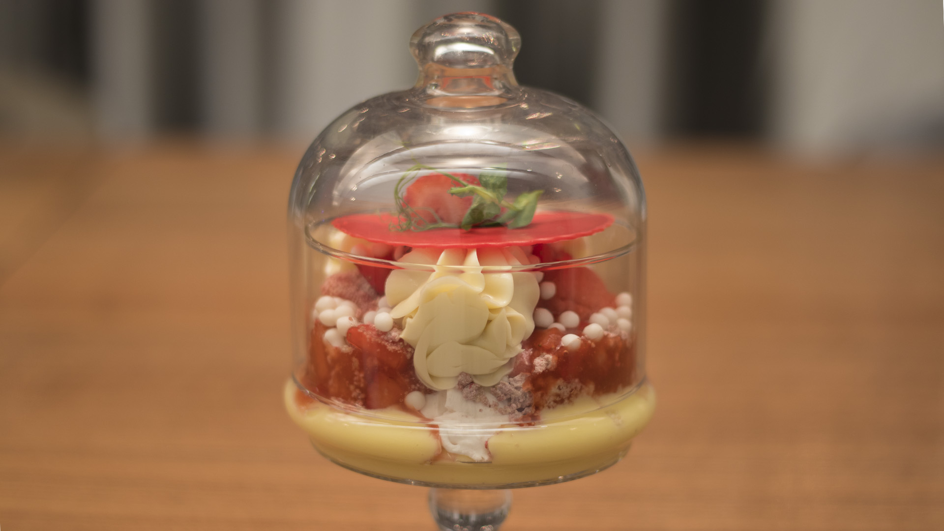 Но хотя подача и красивая, больше всего впечатляет вкус. Это и неудивительно, учитывая, что в состав вошёл клубничный сорбет, малиновый кранч, крем из белого шоколада и клубника.